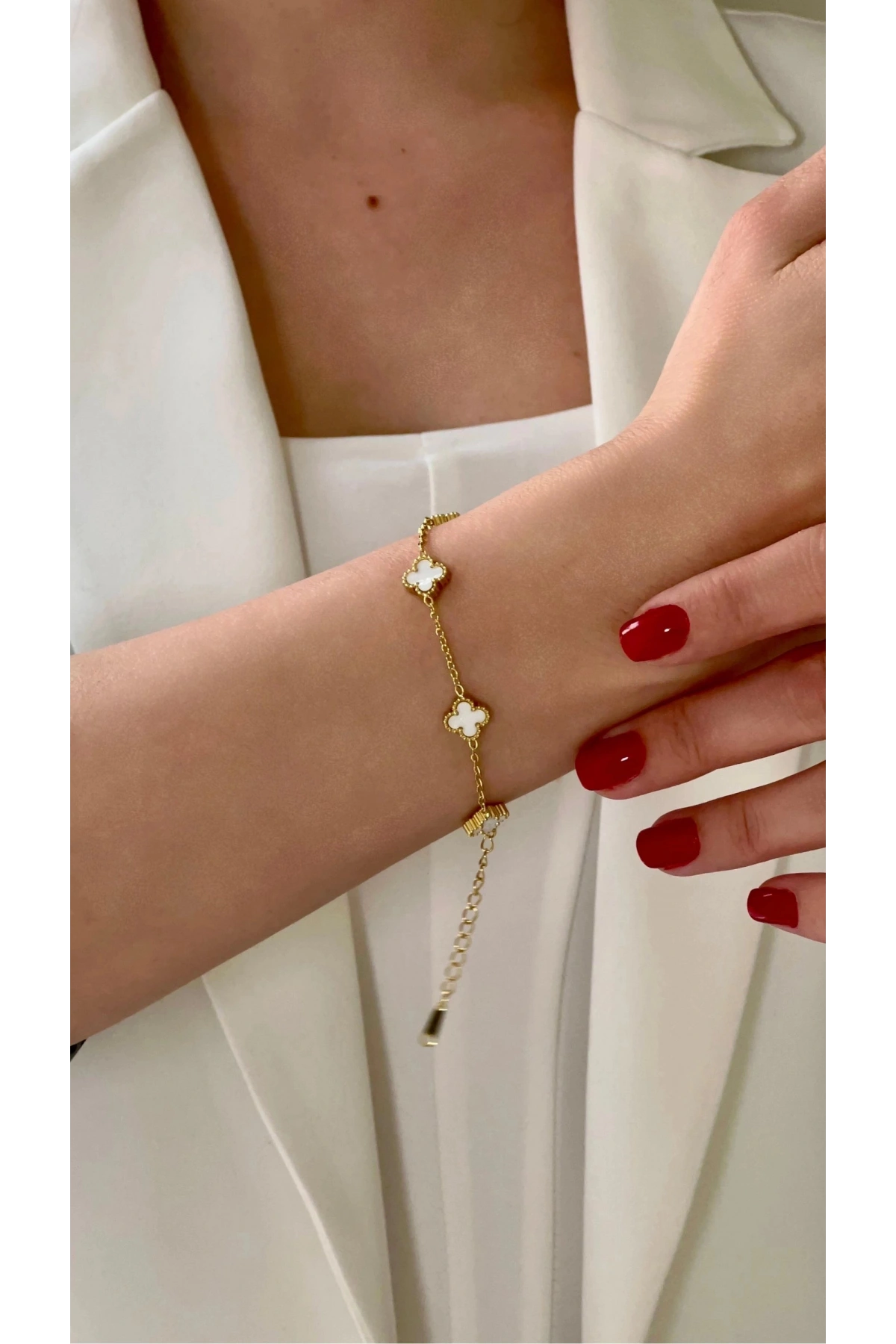 Beyaz Desenli Yonca Detay Gold Altın Kaplama Çelik Bileklik