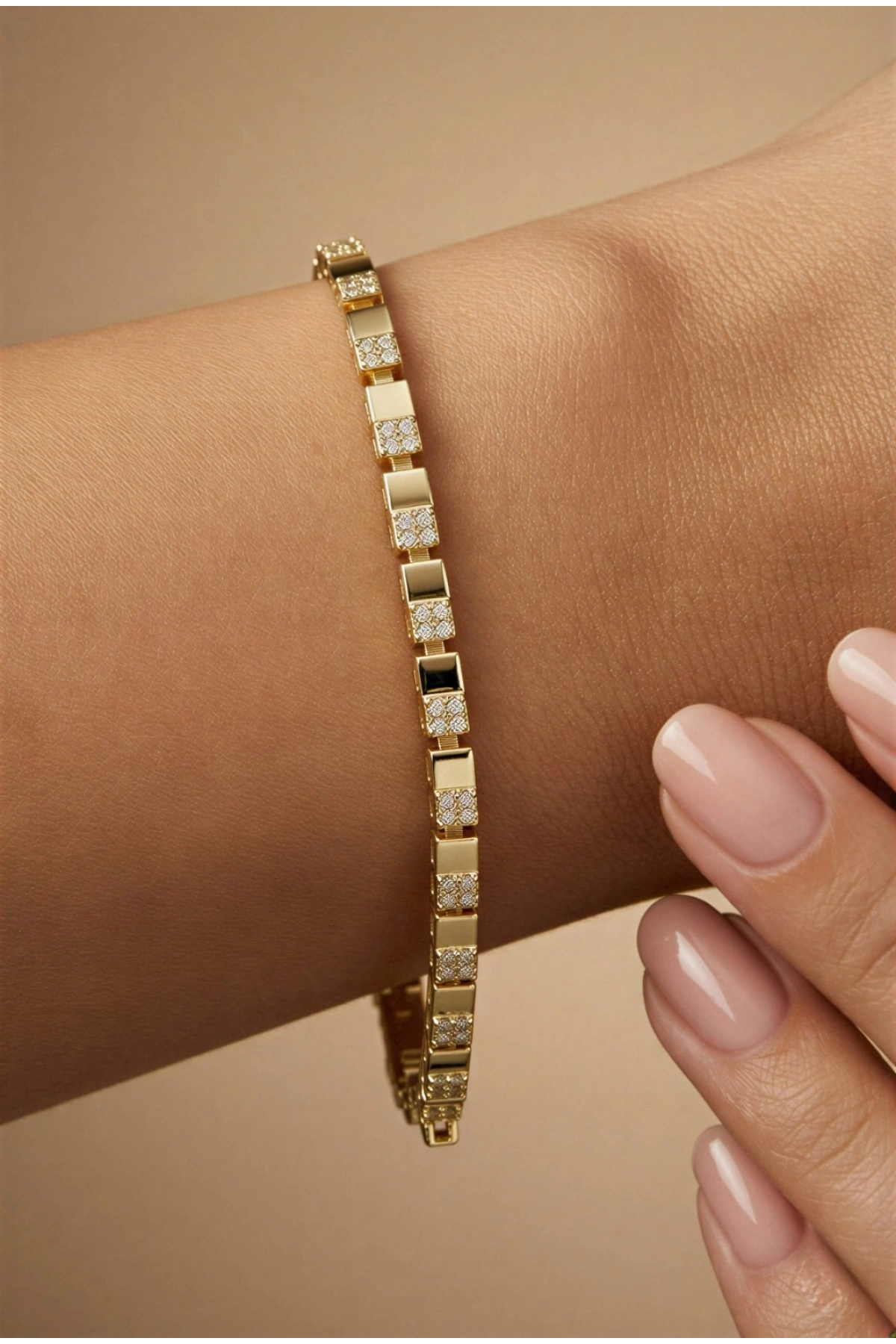Çift Küp Taş Detay Gold Altın Kaplama Bileklik, zarif ve şık tasarımıyla öne çıkan 14K altın kaplama bir bilekliktir. Bu özel tasarım bileklik, her türlü kıyafetle mükemmel uyum sağlar ve stilinize şıklık katar.