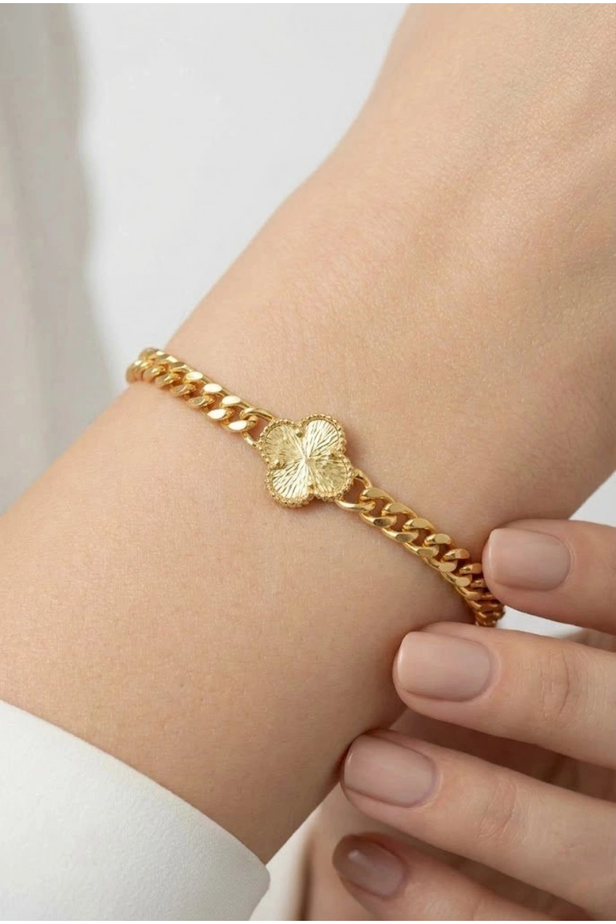 Çizgi Detay Yonca Model Gold Altın Kaplama Bileklik