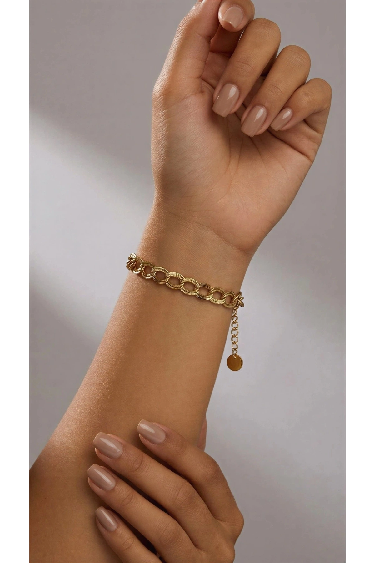 Desenli Çift Halka Model Gold Altın Kaplama Çelik Bileklik