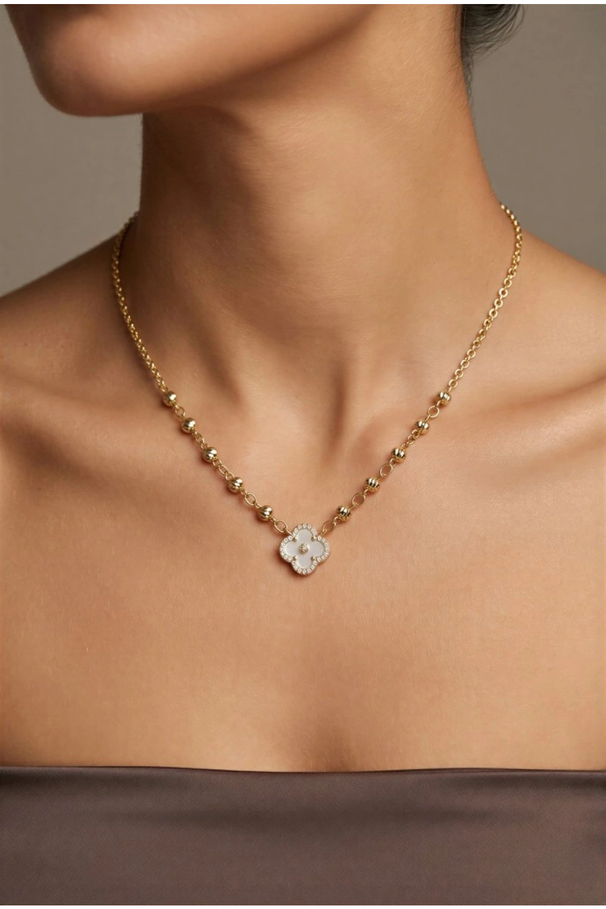 Dorika Detay Beyaz Yonca Model Gold Altın Kaplama Kolye