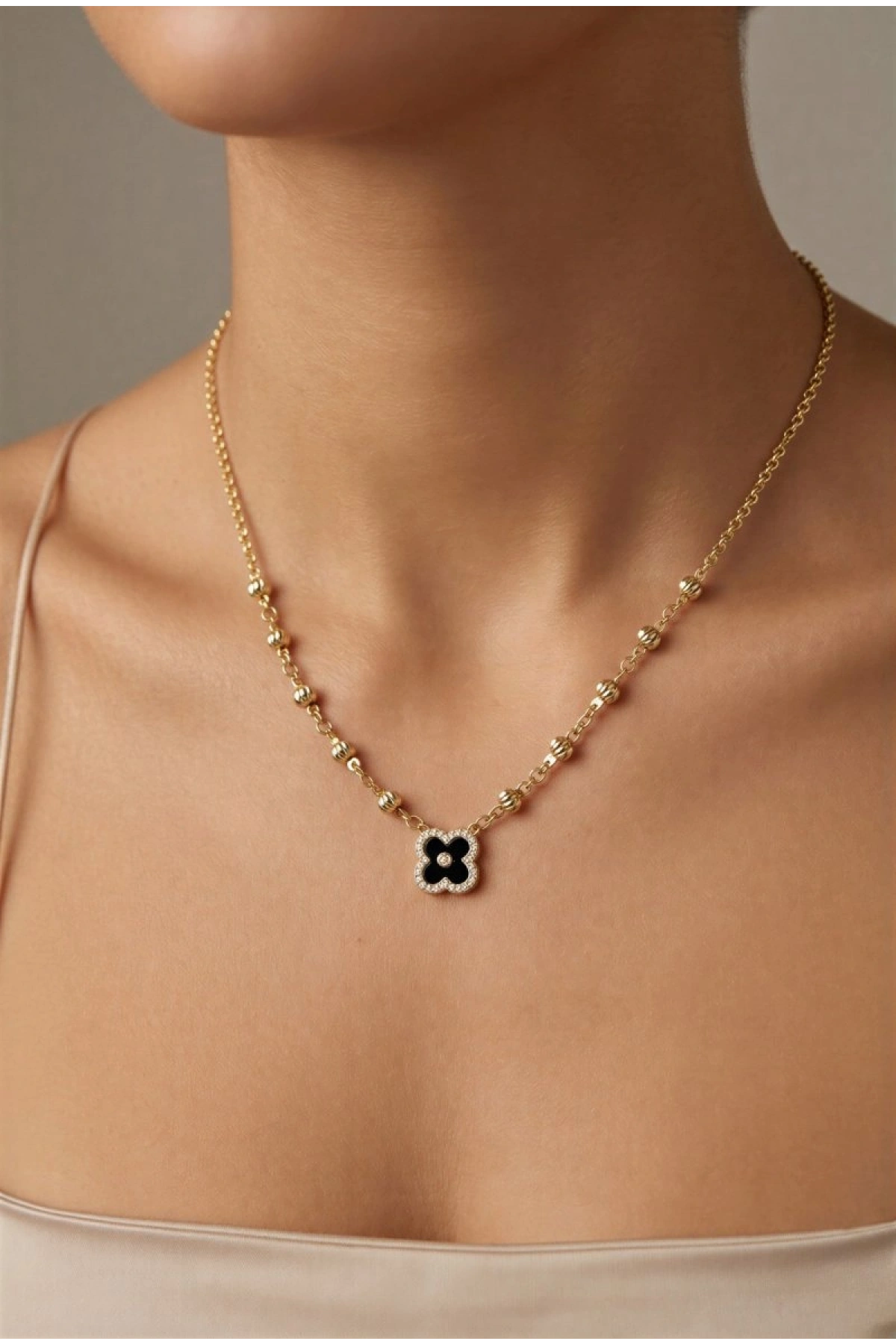 Dorika Detay Siyah Yonca Model Gold Altın Kaplama Kolye