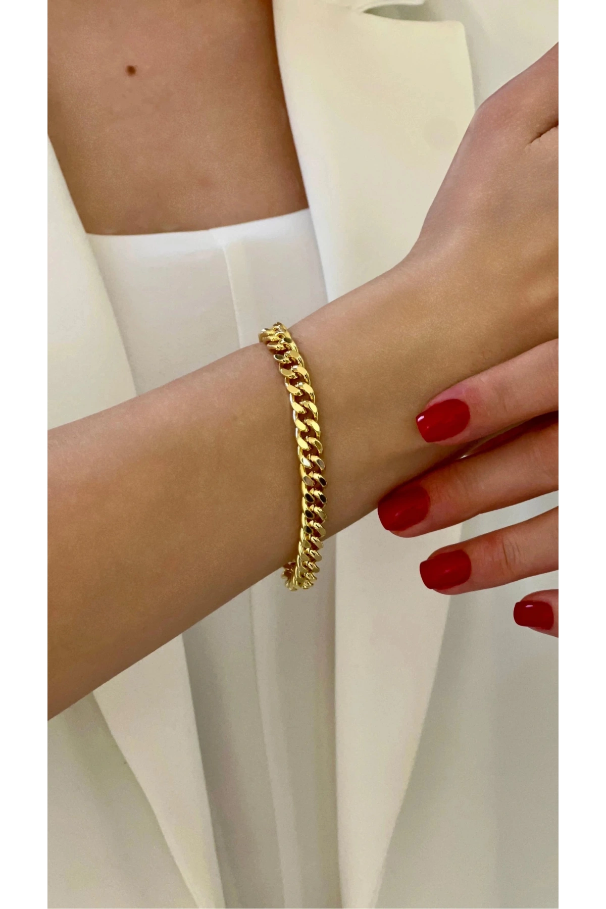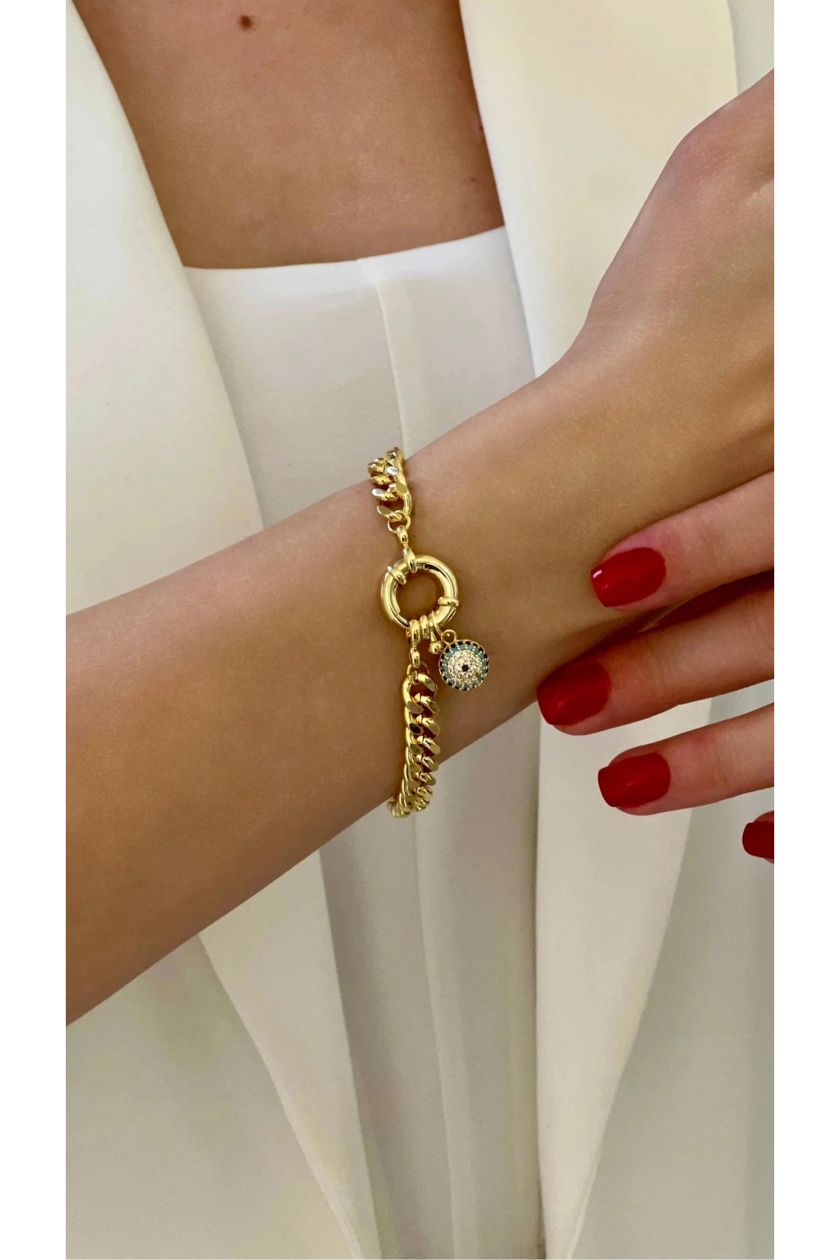Bu şık bileklik, şıklık ve zarafet arayanların favorisi olmaya aday! Altın kaplama ile tasarlanmış, zincir dümen kilit göz detayıyla benzersiz bir görünüme sahip. Hem günlük hayatta hem de özel davetlerde rahatlıkla kullanabileceğiniz bu bileklik, tarzınıza şıklık katacak. Hediye seçenekleri arasında da ilk sıralarda yer alabilir.