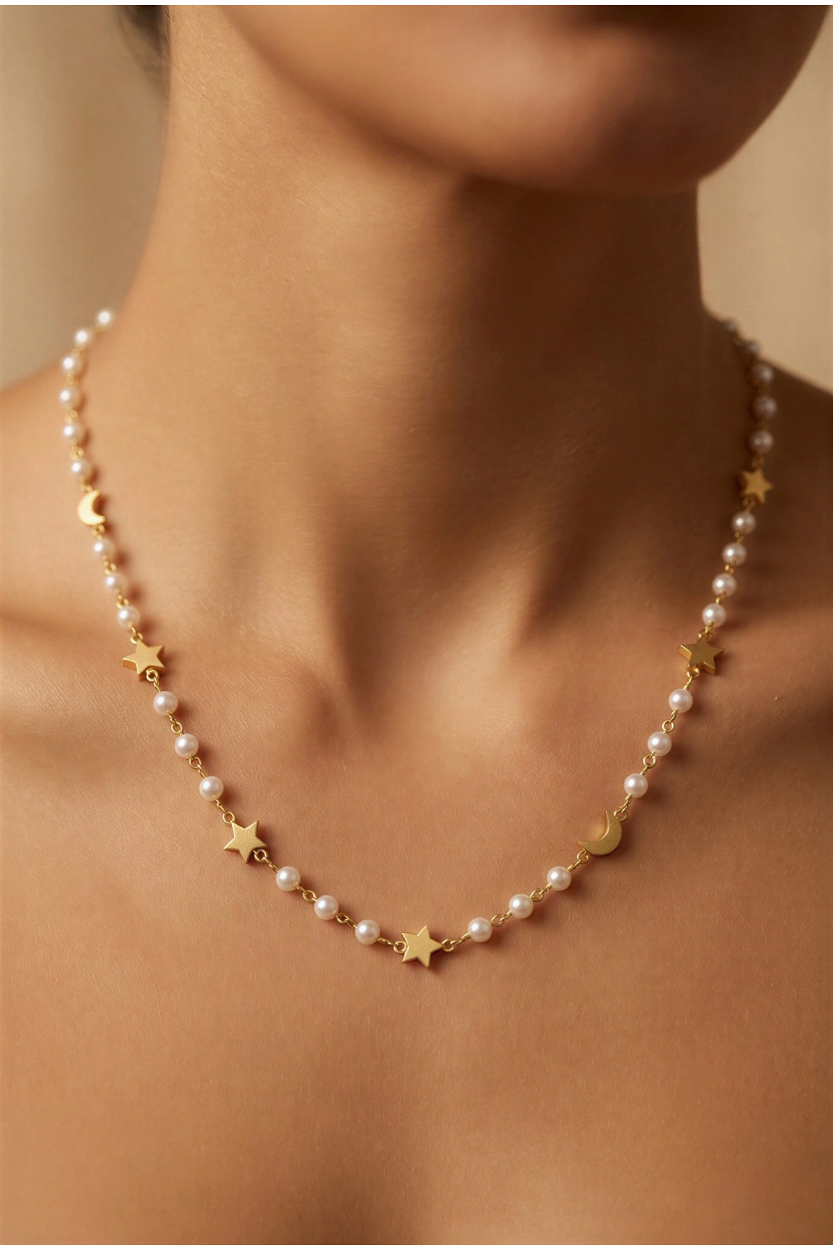 İnci Detay Ay Yıldız Model Gold Altın Kaplama Kolye