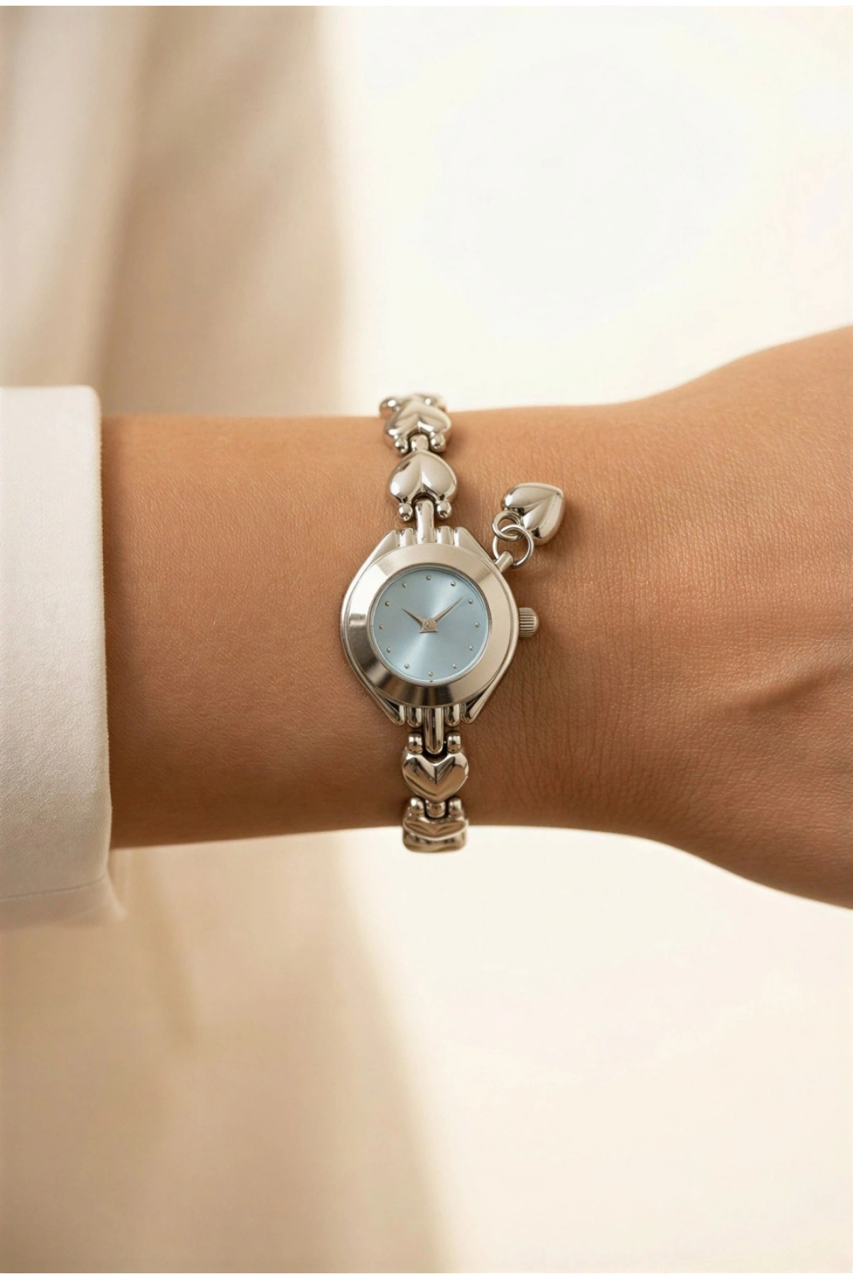 Kalp Charm Detay Silver İçi Mavi Kadın Kol Saati, şıklığı ve zarafeti bir arada sunan bir aksesuardır. İşte sahip olduğu özellikler: