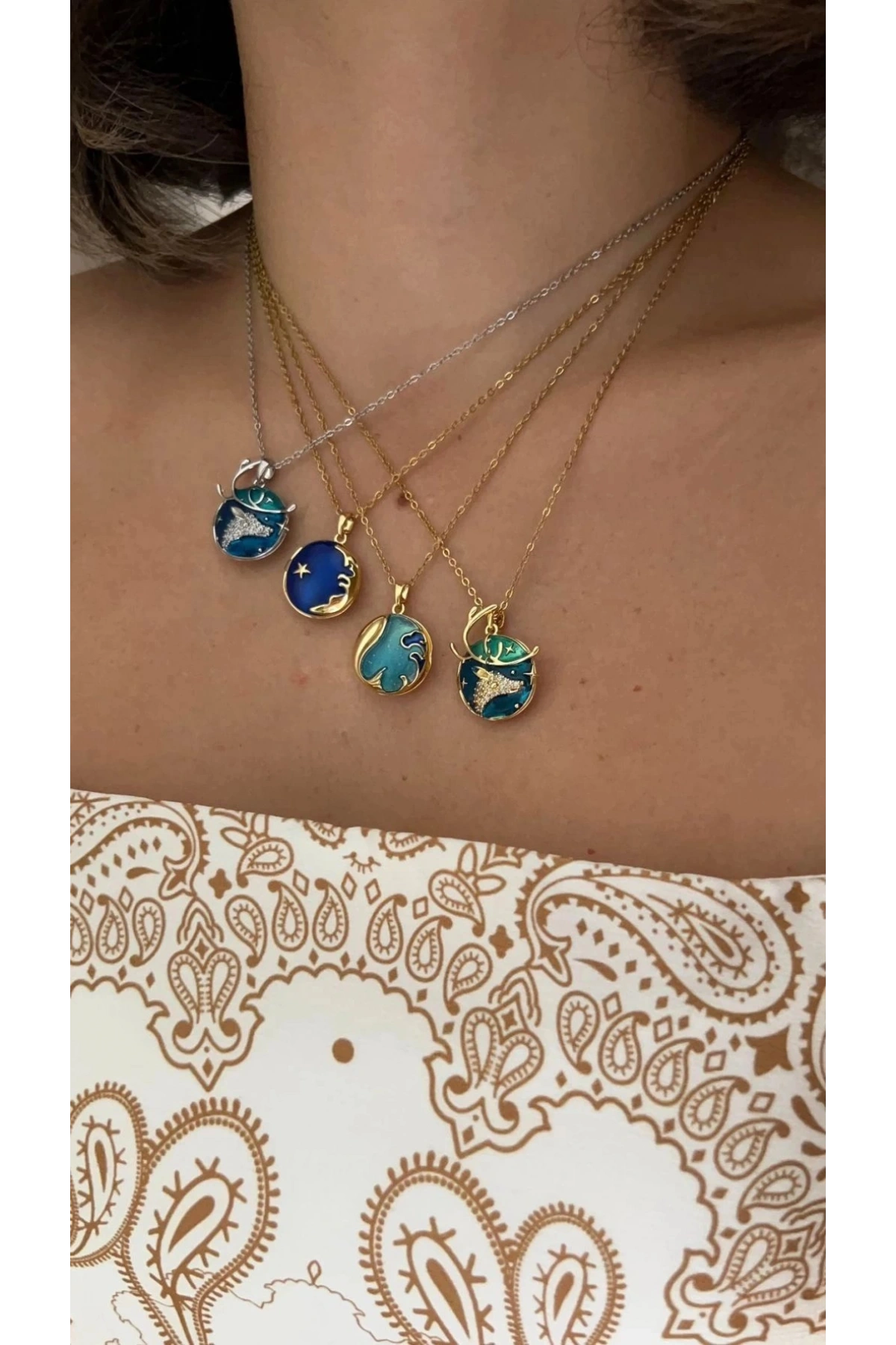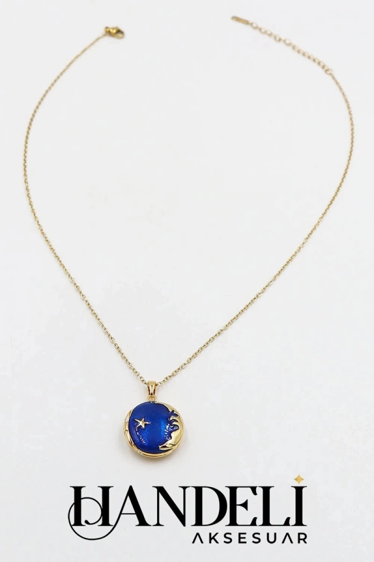 Lacivert Oval Taban Ay Yıldız Detay Gold Altın Kaplama Kolye