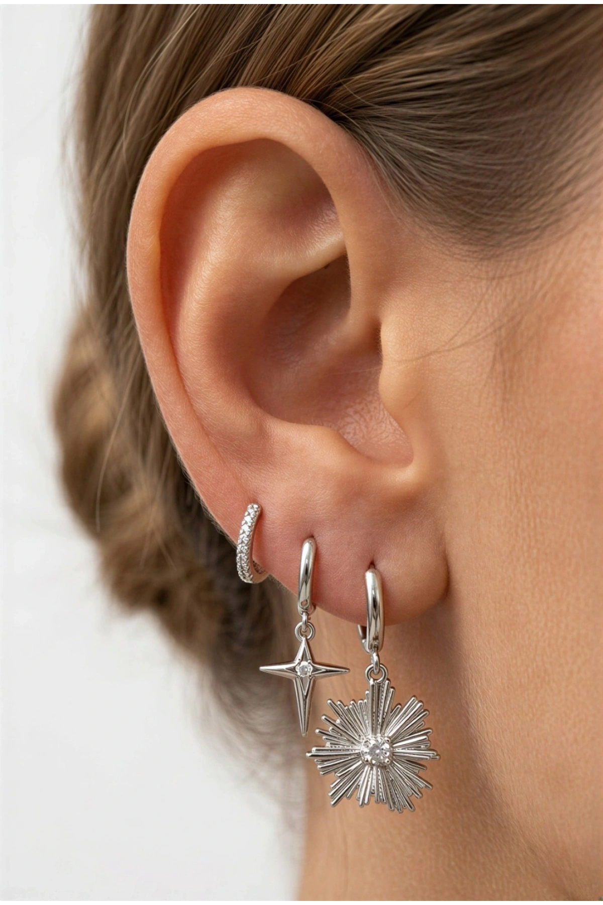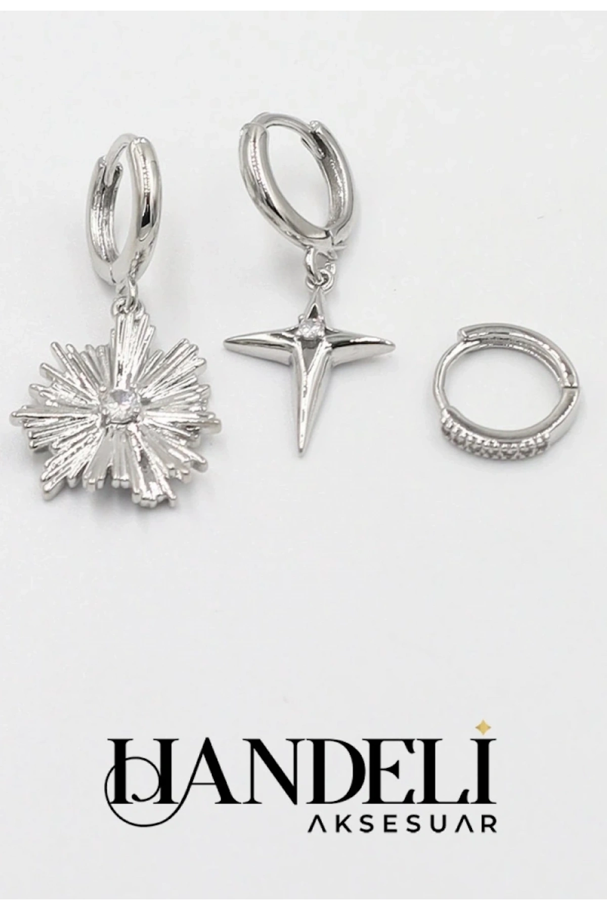 Meteor Detay Beyaz Altın Kaplama Üçlü Küpe