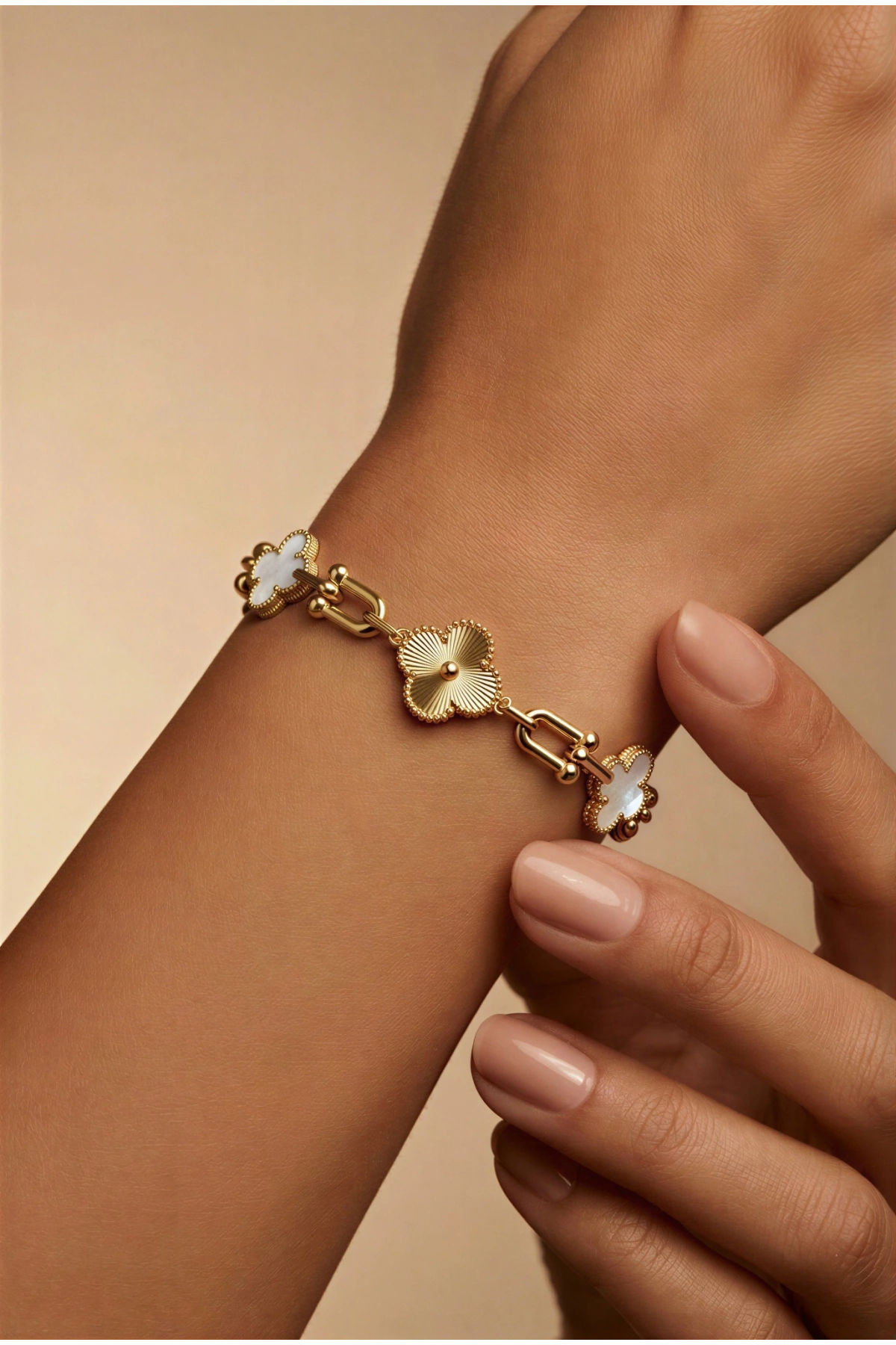 Nal Zincir Beyaz Yonca Model Gold Altın Kaplama Bileklik