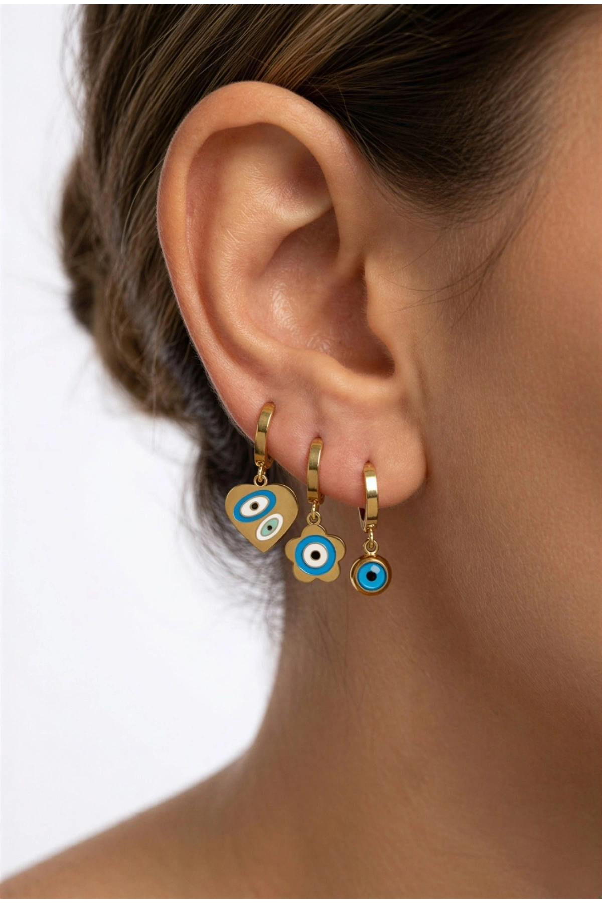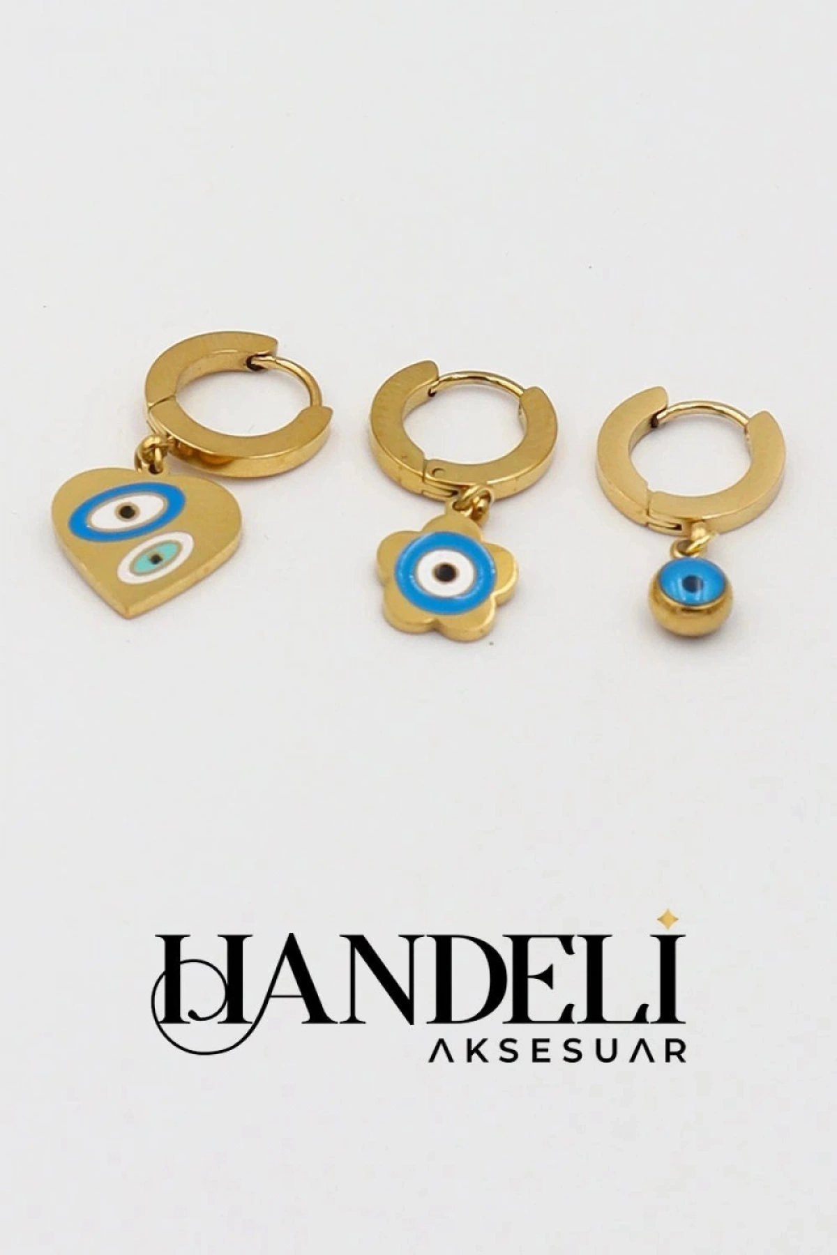 Nazar ve Çiçek Detay Gold Altın Kaplama Çelik Üçlü Küpe