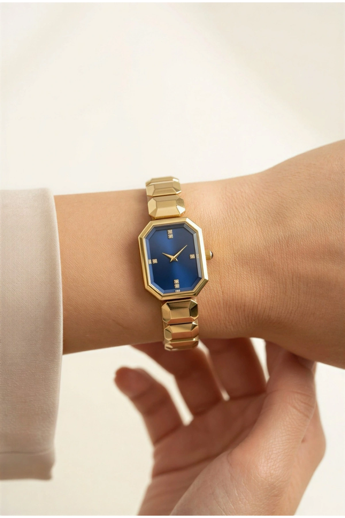 Sekizgen Model Gold Kordon Lacivert Kadran Kadın Kol Saati