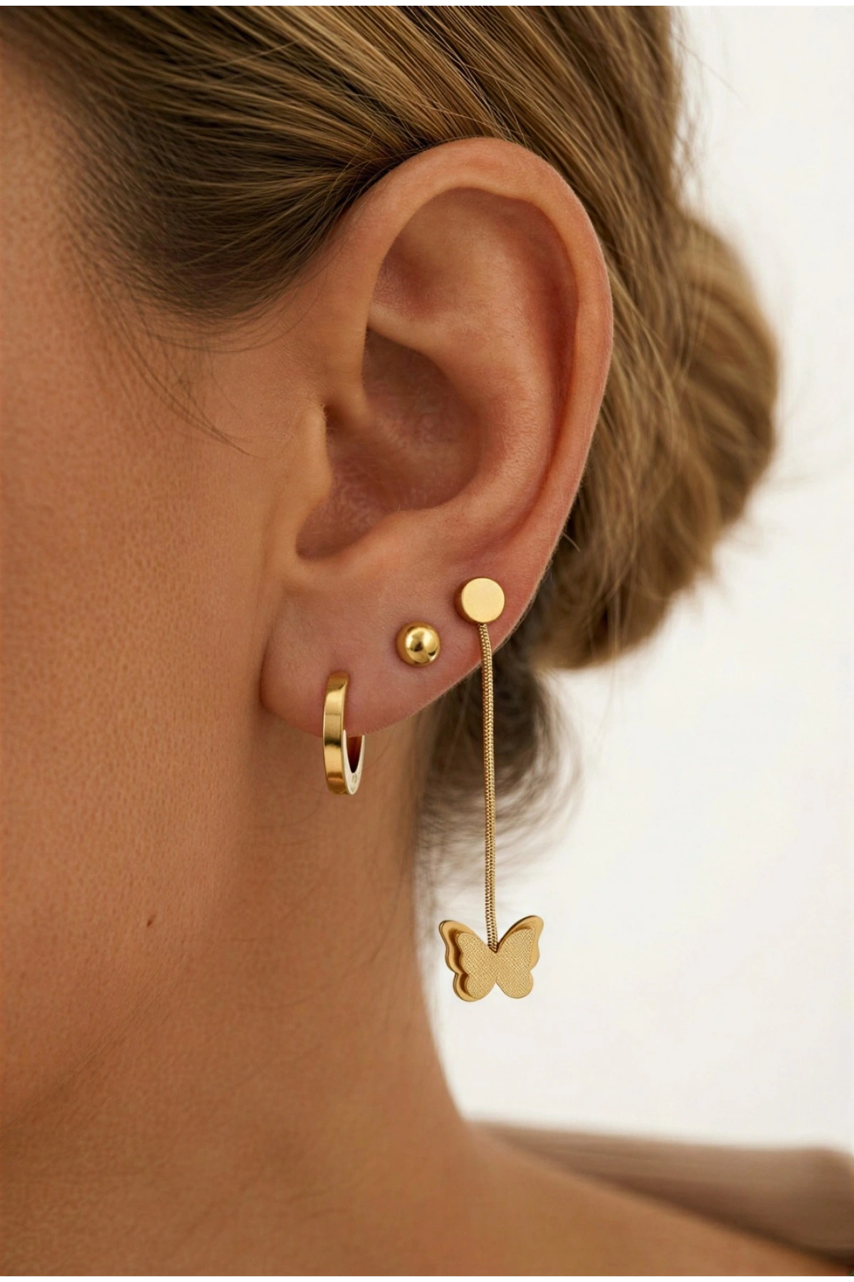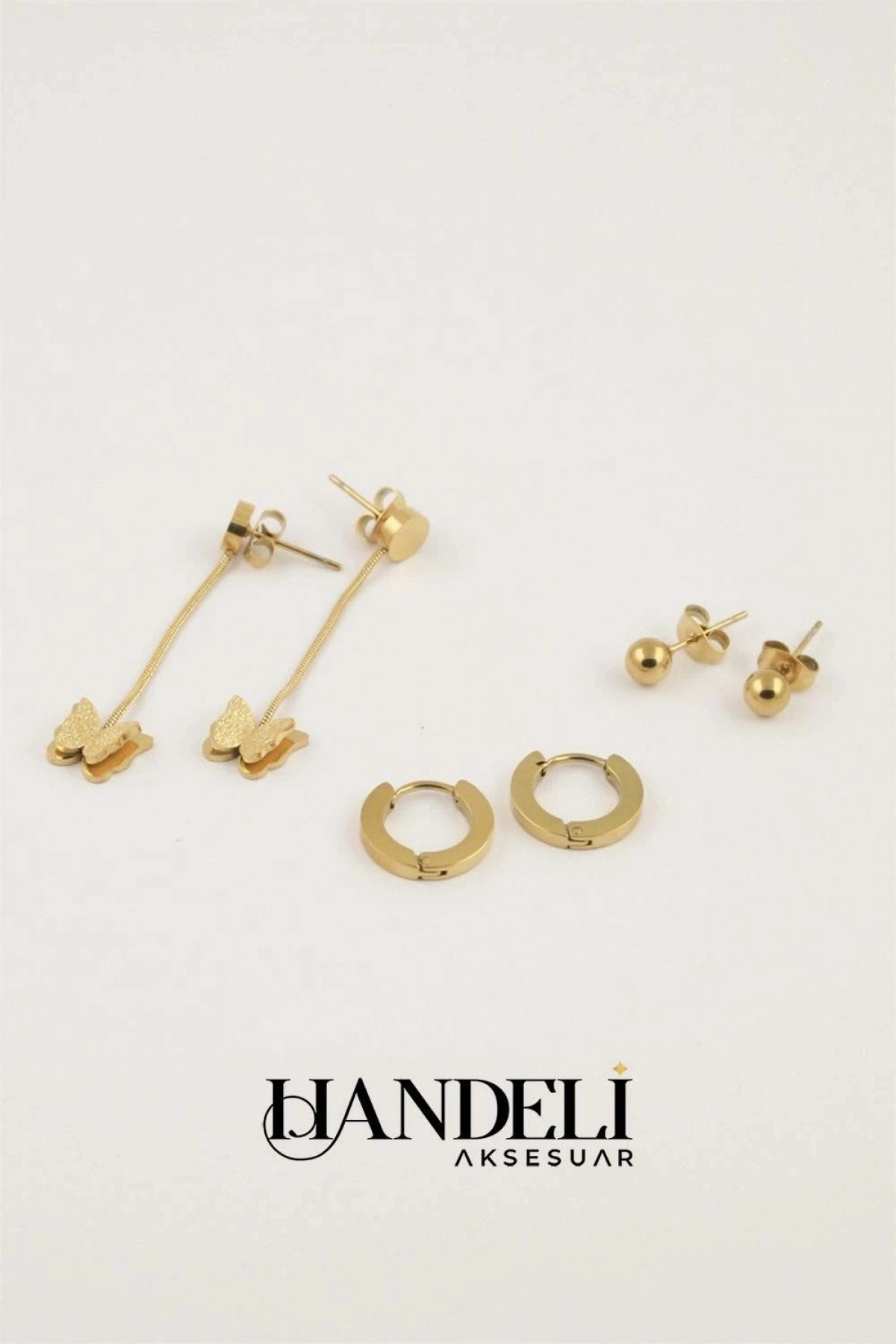 Simli Kelebek Model Top Kulaklık Altılı Gold Altın Kaplama Küpe