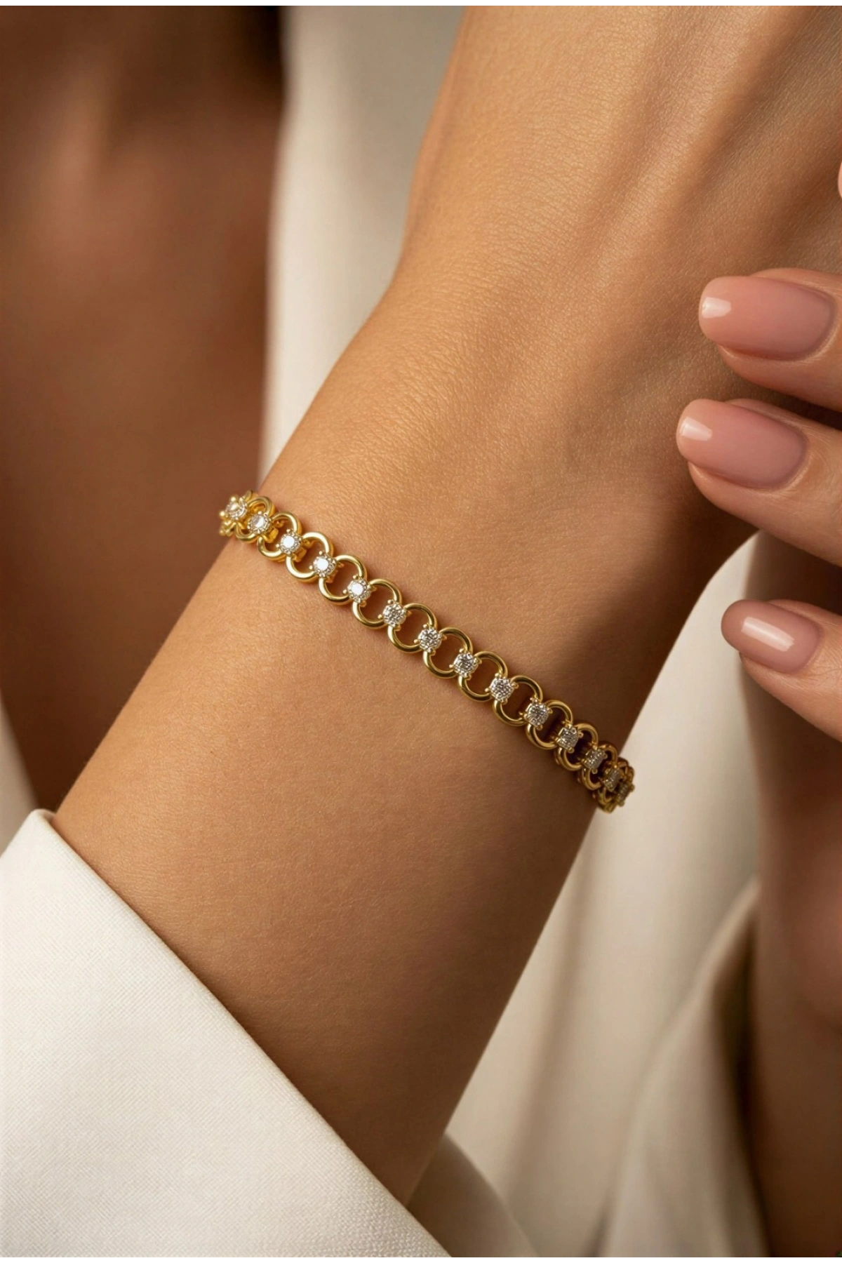 Altın kaplama bileklikler kadınların günlük hayatta veya özel günlerde şıklığını tamamlayan vazgeçilmez aksesuarlarıdır. Sıralı halka arası taş detayıyla dikkat çeken 14K altın kaplama bileklik, zarif tasarımıyla göz kamaştırıyor. İnce detaylarıyla ve şık görünümüyle her tarz kıyafetle kolayca kombinlenebilir.