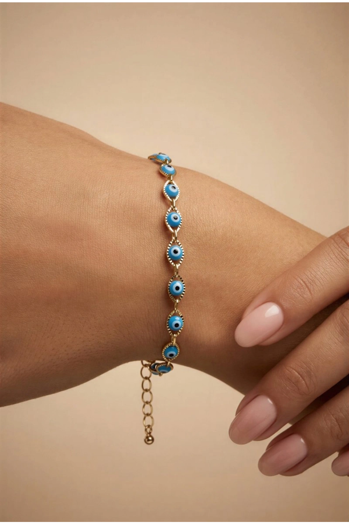 Sıralı Mavi Nazar Boncuk Model Gold Altın Kaplama Bileklik