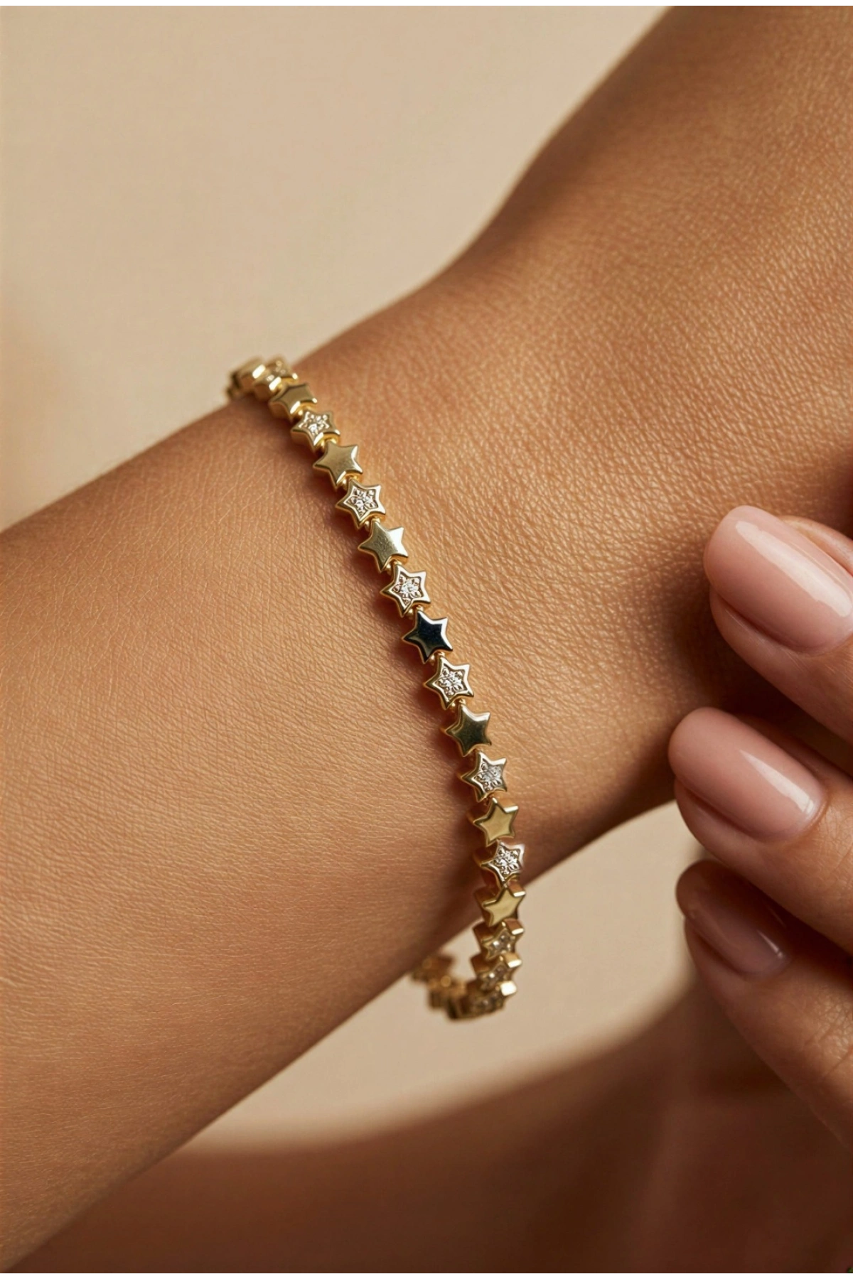 Sıralı Taşlı Yıldız Desen Gold Altın Kaplama Bileklik