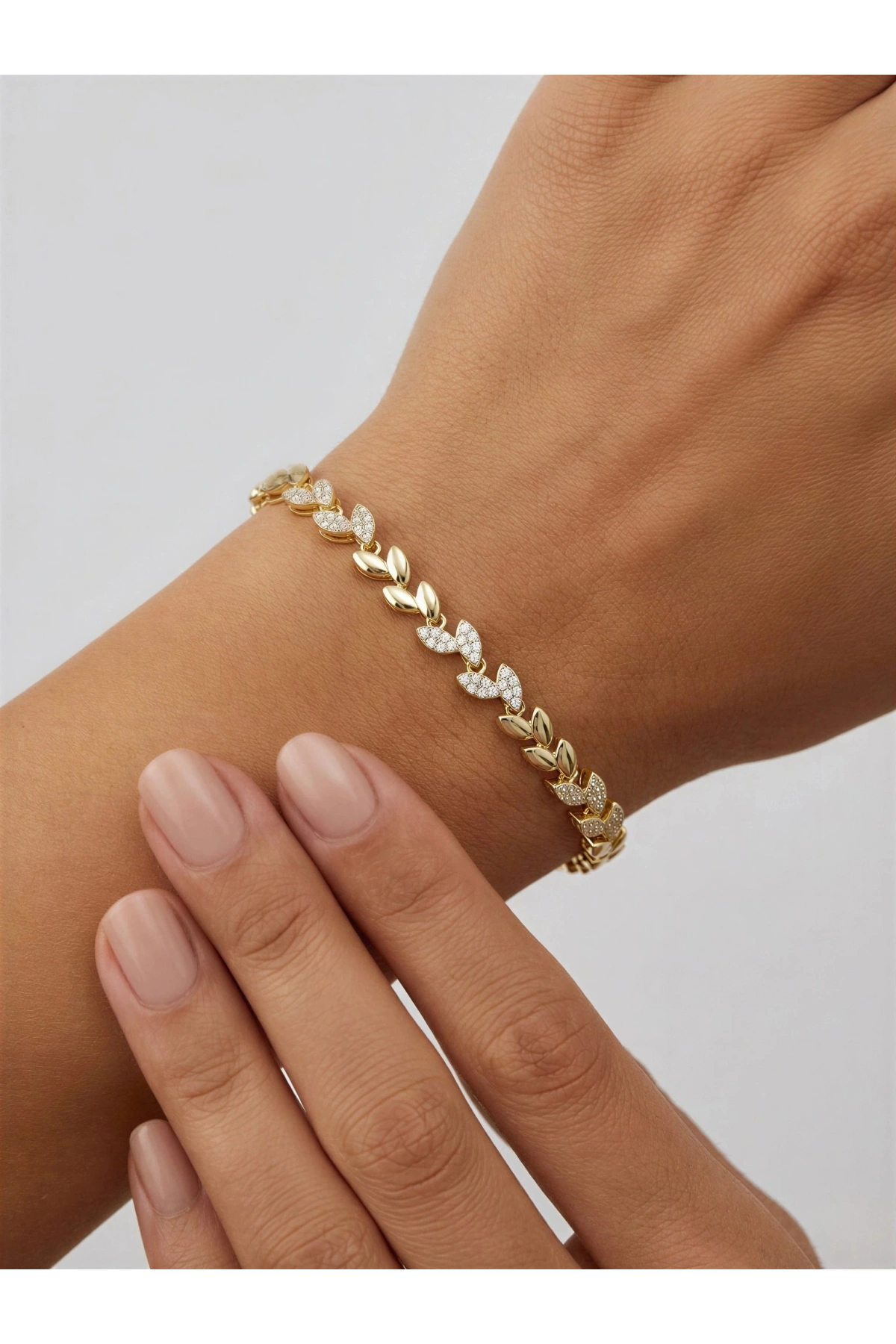 Sıralı Yaprak Model Taş Detay Gold Altın Kaplama Bileklik