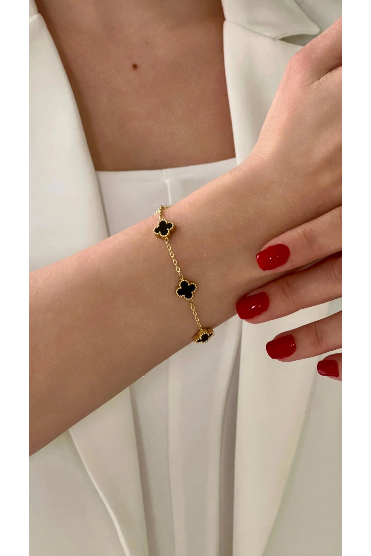 Siyah Desenli Yonca Detay Gold Altın Kaplama Çelik Bileklik