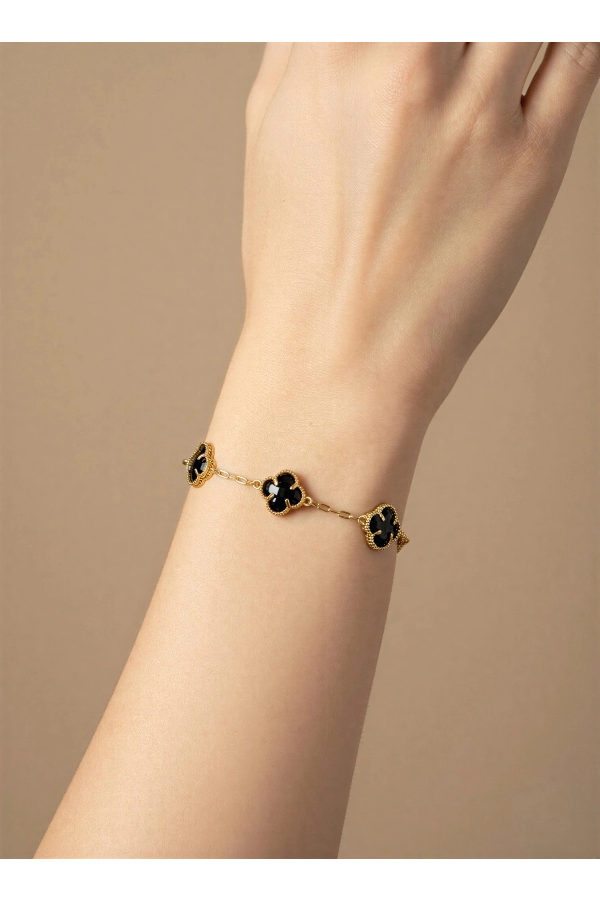 Siyah Renk Yonca Detay Gold Altın Kaplama Bileklik