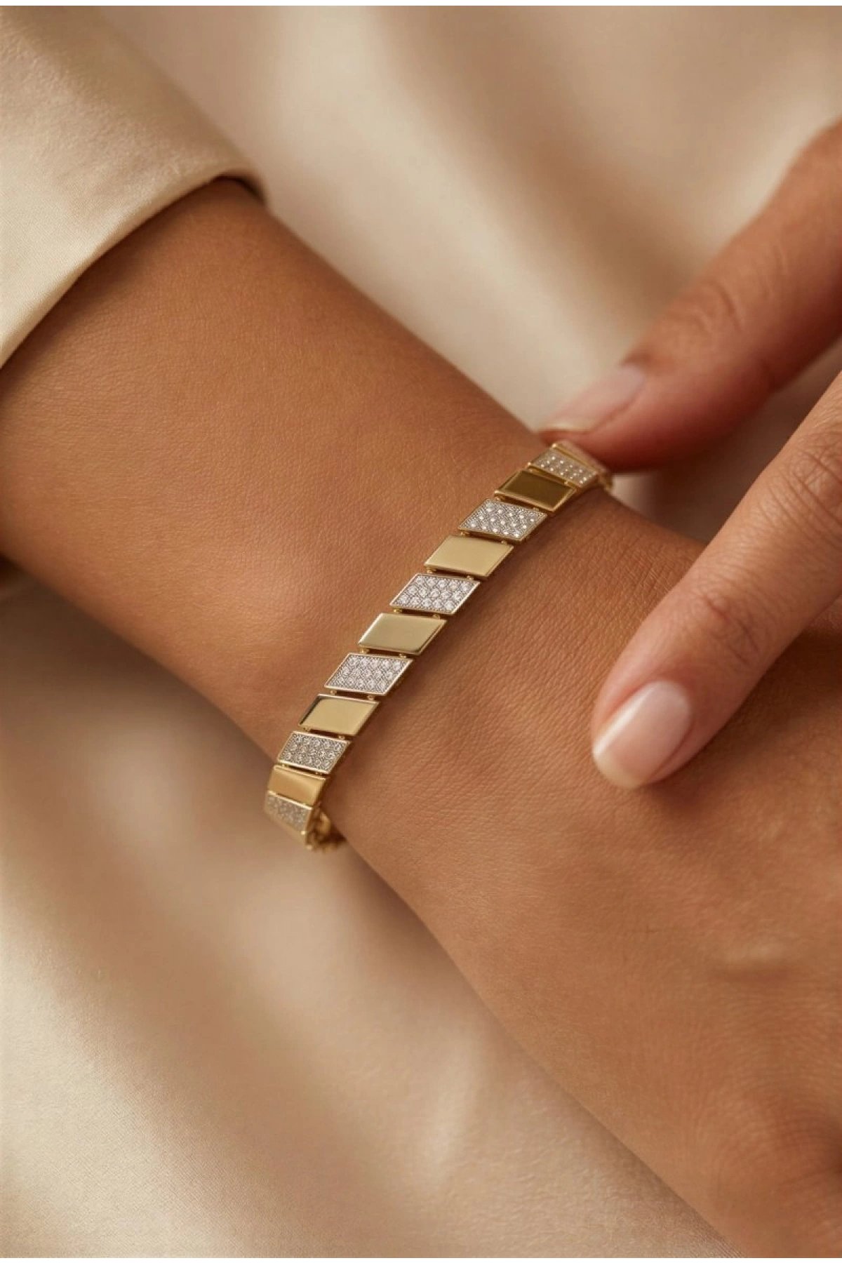 Taş Detay Eğik Model Gold Altın Kaplama Bileklik