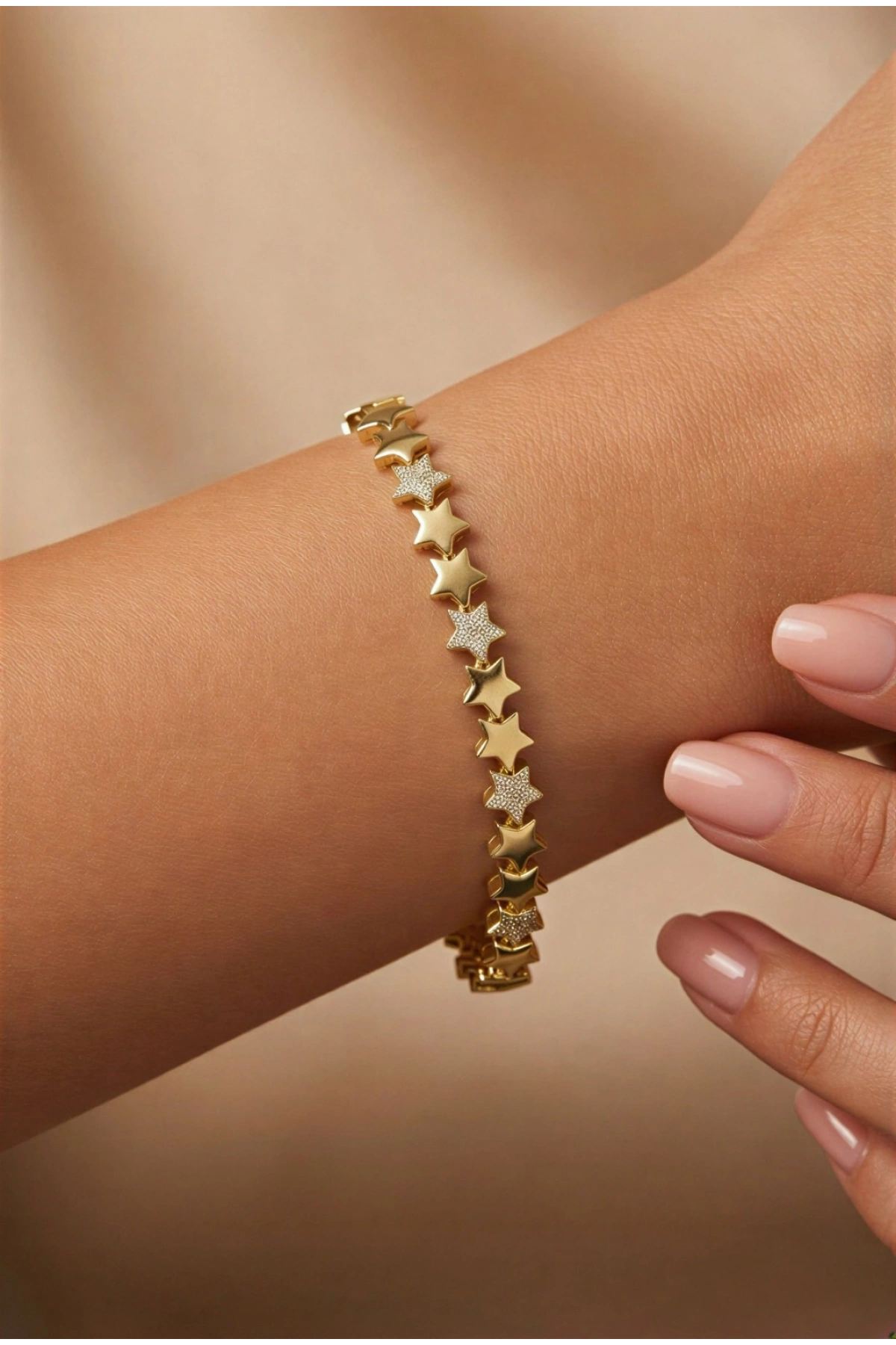 Taş Detay Yıldız Model Gold Altın Kaplama Bileklik