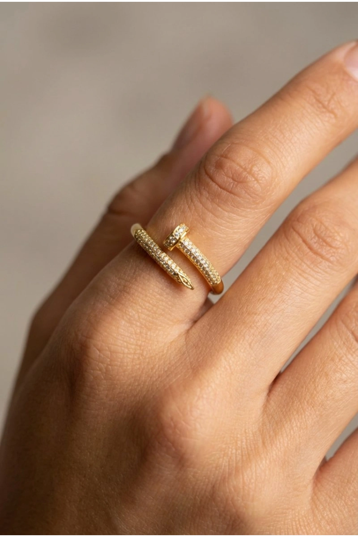Taşlı Çivi Model Gold Altın Kaplama Ayarlanabilir Yüzük