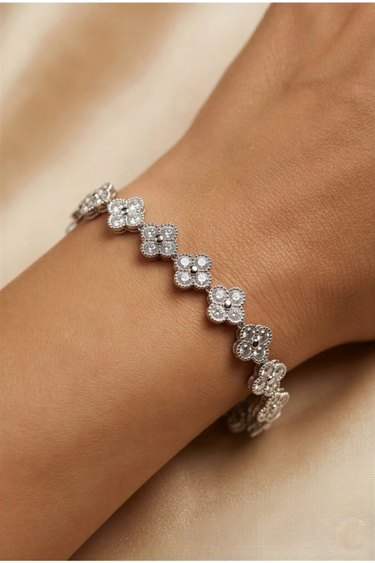 Taşlı Yonca Model Beyaz Altın Kaplama Bileklik