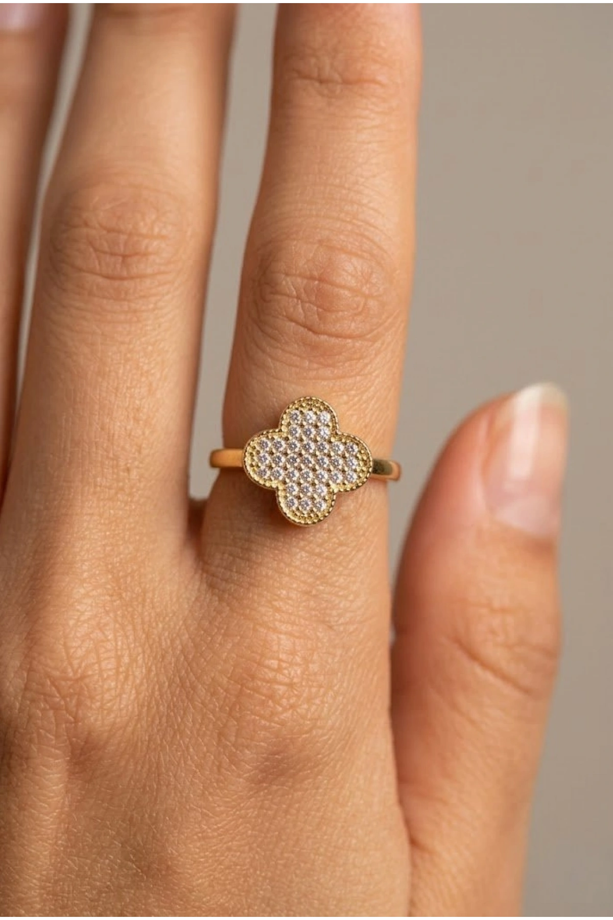 Taşlı Yonca Model Gold Altın Kaplama Ayarlanabilir Yüzük