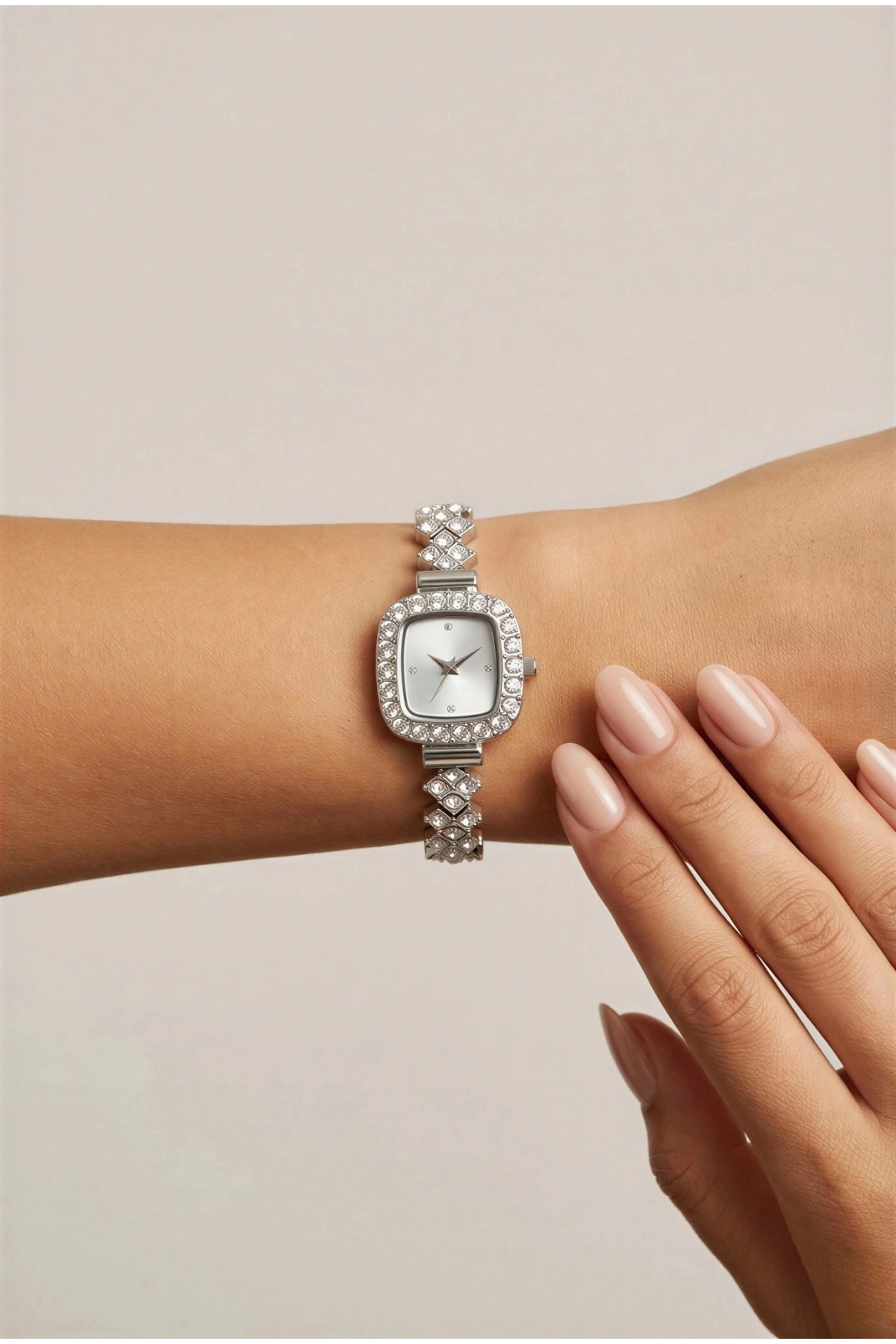 Yoncalı Taş Kordon Detay Beyaz Metal Kadın Kol Saati