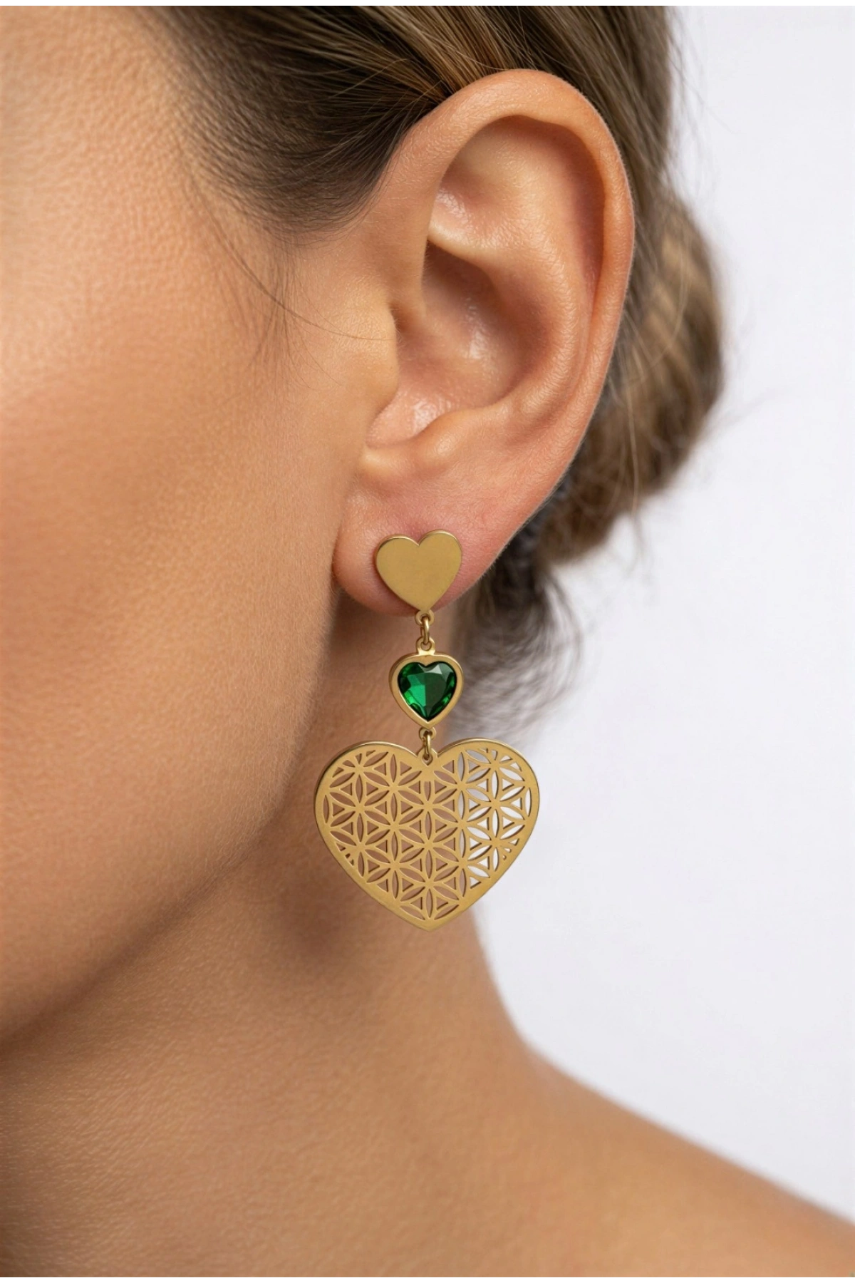 Zümrüt Taş Detay Kalp Model Gold Çelik Altın Kaplama Küpe